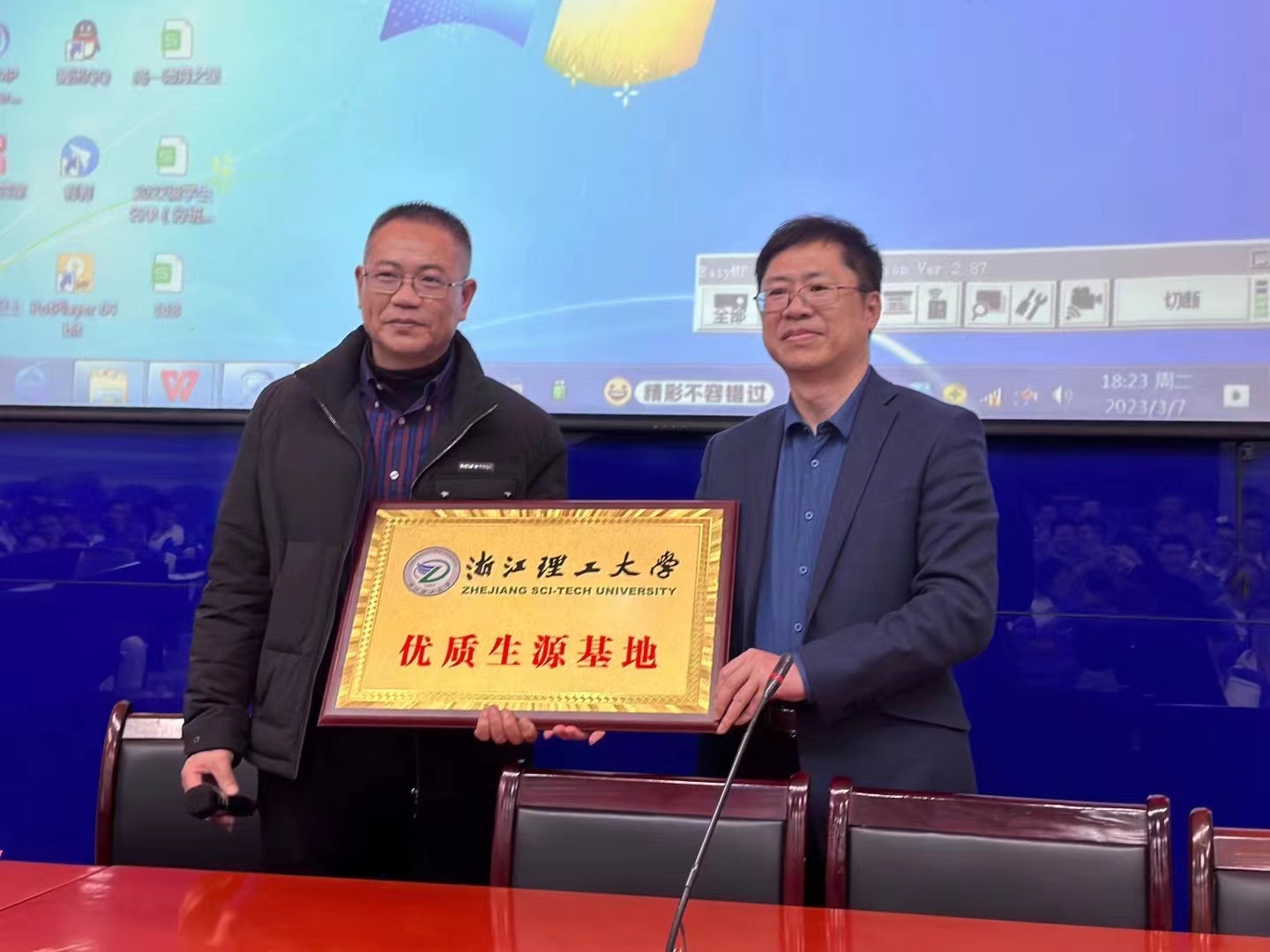 授予平阳县鳌江中学“优质生源基地”称号,李伟君代表鳌江中学接牌。
