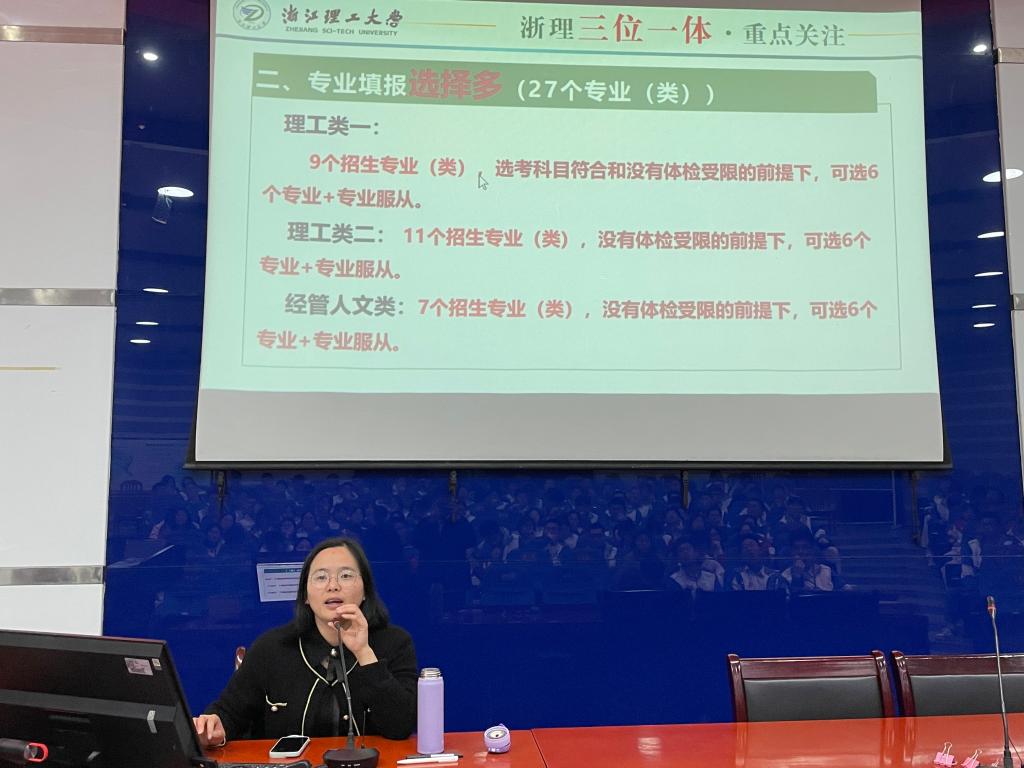 会后,朱敏以“来浙理,成长为最好的自己”为主题,从学校的办学实力、专业特色、“三位一体”政策解读等方面为两所中学的高三学生进行宣讲。现场高三学子热情高涨,就学科专业、大学生活、招生政策等方面进行提问。朱敏耐心地一一进行解答,欢迎各位优秀学子报考葡京娱乐场