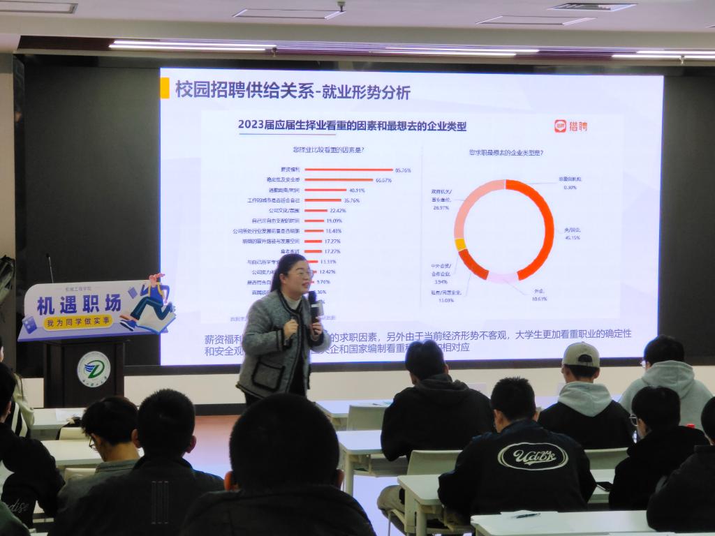 活动中,姜淑飘导师从校园招聘的供需关系以及整体的就业形势两个维度进行了深入的分析,帮助学生更清晰地了解当前就业市场的动态和趋势,以便做出更为明智的职业选择。姜淑飘导师还结合自身就业选择及经历,向大家展示了多样化的生涯规划路径,并鼓励大家坚定自己的选择,合理规划个人的职业生涯。