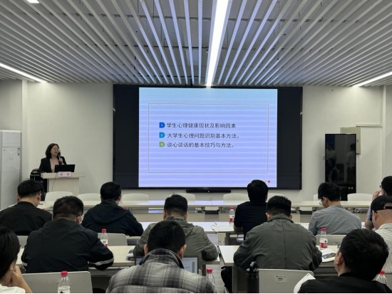 会后,学院邀请校心理健康教育中心专职教师、心理学博士、心理学专业硕士研究生导师陆雯教授,为班主任和辅导员老师开展心理健康教育专题培训。陆雯从学生心理健康现状及影响因素、大学生心理问题识别基本方法和谈心谈话的基本技巧与方法三个方面讲解了心理健康教育工作的基本方法和路径。