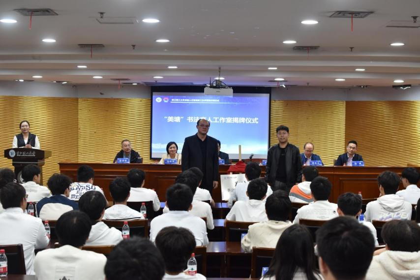 为全面加强和改进学校美育,提高学生审美和人文素养,成立了“美塘”书法育人工作室,胡琦与工作室负责人李家乐共同为“美塘”书法育人工作室揭牌。