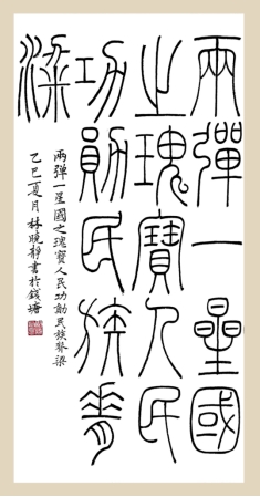 (作者:林晓静 书体:篆书 内容:两弹一星,国之瑰宝;人民功勋,民族脊梁)