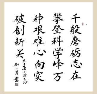 (作者:刘小渭 书体:楷书 内容:千般磨砺,志在攀登。科学峰万种,艰难心向,突破创新关)