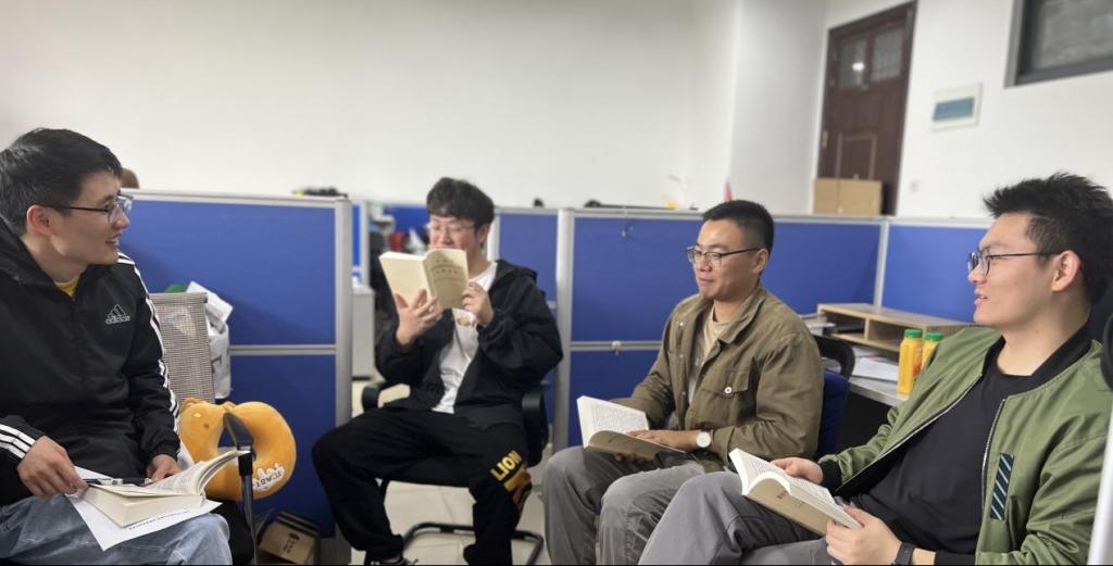 全体师生融入学。全院师生自发开展“理论学习‘一刻钟’”,以实验室、寝室、办公室为单位,结合实际学习《习近平新时代中国特色社会主义思想专题摘编》等书籍。年级辅导员走访实验室期间,组织智能农装实验室研究生一同开展理论学习。