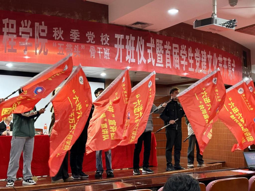 为进一步提高学生党员的综合素质,充分发挥新时代大学生党员的先锋模范和骨干带头作用,学院举办“青春心向党,奋进新征程”首届学生党建文化节,围绕强基固本-筑牢“红色堡垒”、守根铸魂-固紧“红色根基”、接续传承-点燃“红色引擎”、笃行致远-再创“红色传奇”四个篇章开展系列学生党建活动。同时,学院实施学生党员“五个带头”作用发挥承诺机制,成立“五带头骨干班”和“六进六讲”宣讲团。学校组织部(统战部)干部张维标老师为宣讲团代表授旗。